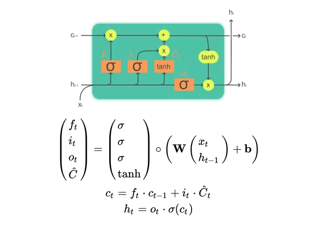 Matrix algebra representation of an LSTM node. Here `t` represents the time step in the sequence, sigma represents the sigmoid function.