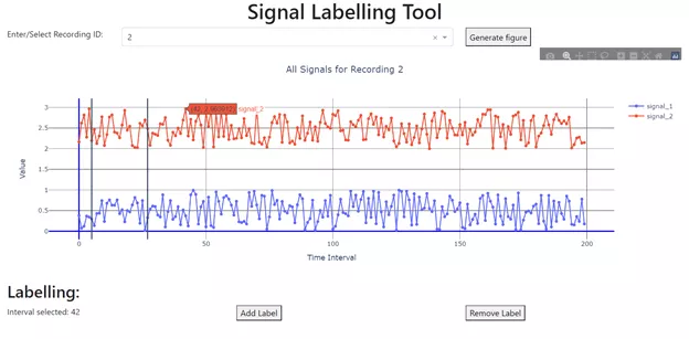A semi-supervised approach can be taken to labelling. An initial approach such as a convolution-based algorithm designed by a subject matter expert can be used to label the data where each label has a certainty associated. Labels that pass the certainty threshold are committed as labels to train an initial model against. Labels below the threshold are reviewed by a human expert in a labelling tool specifically designed and implemented for this purpose. An example of the tool can be seen in below.