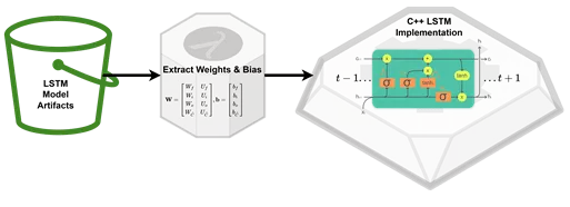 Conceptually an LSTM node is one of the more involved node types that can be found in a DNN. However, when we break it down, we find the operations in each node can be mathematically represented by the matrix algebra in seen above. The only difference between the different nodes is then the trainable parameters; the matrix of weights (W) and the matrix of biases (b). By stripping away the parts of the implementation that are required for a package such as TensorFlow to enable functionality such as back-propagation for training, we are left with just these essential matrix operations for inference. It is then clear how this satisfies the requirement in the IoT space for a lightweight model implementation on a compute-limited embedded device.